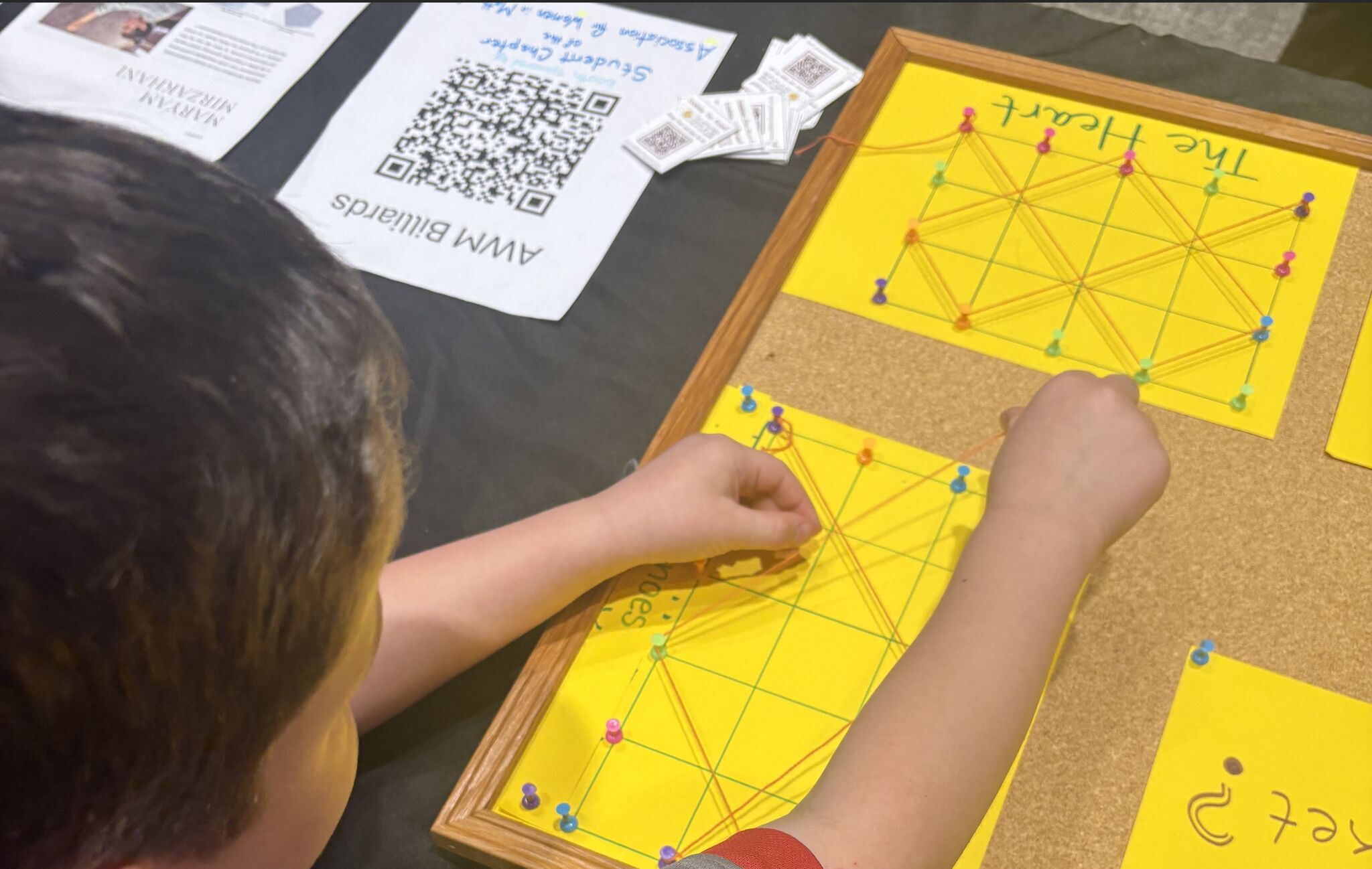 The event was held at the public library and featured several booths displaying different concepts and topics in mathematics. The booth I helped manage honored the work of the famous female mathematician Maryam Mirzakhani. We used strings to model shapes created by the trajectory of a ball on a billiards table.