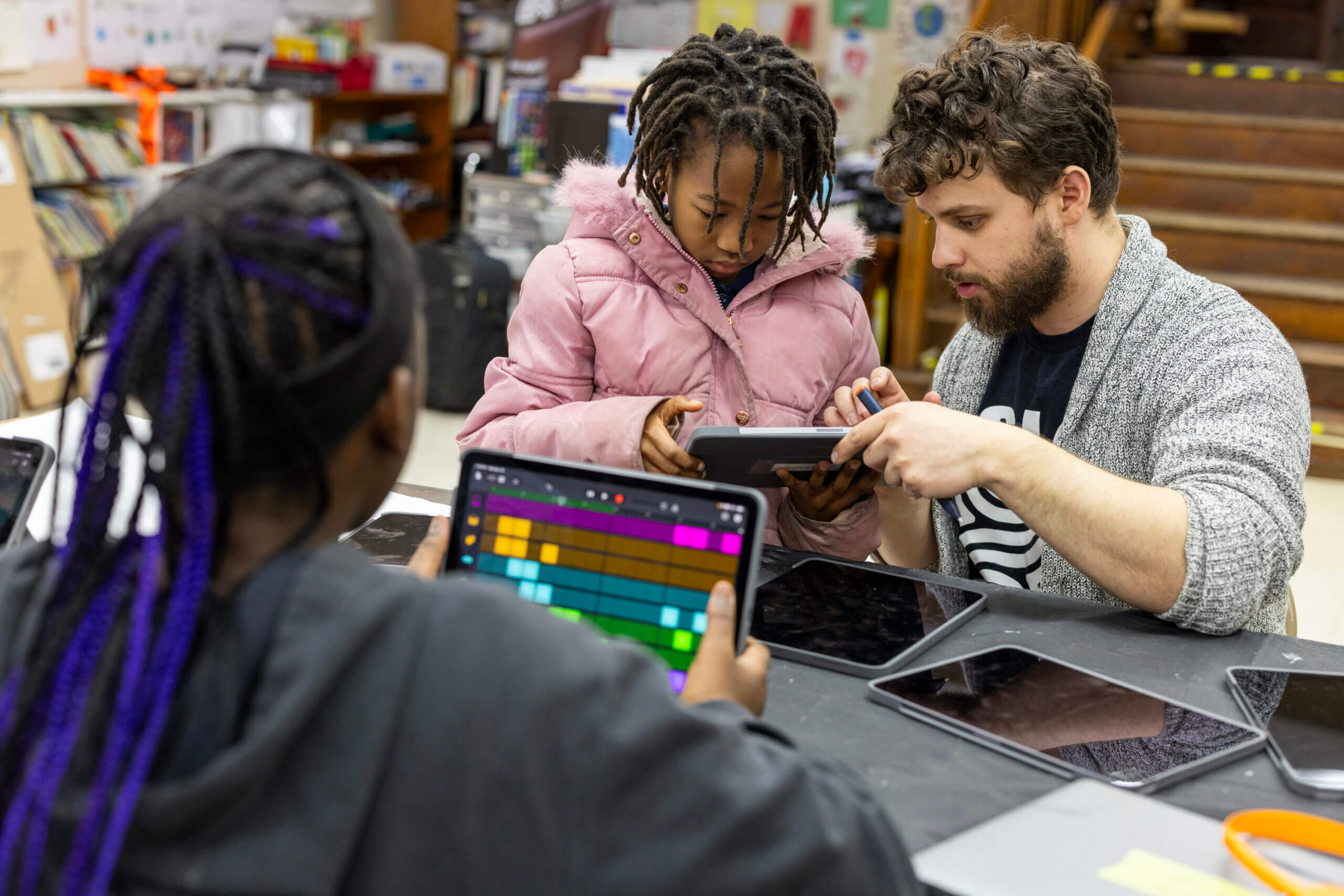 A man helps a young girl in a pink coat use a tablet, while another child with purple braids works on a colorful music app on a tablet at a classroom table.