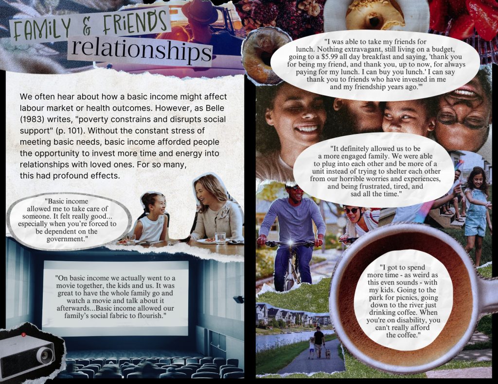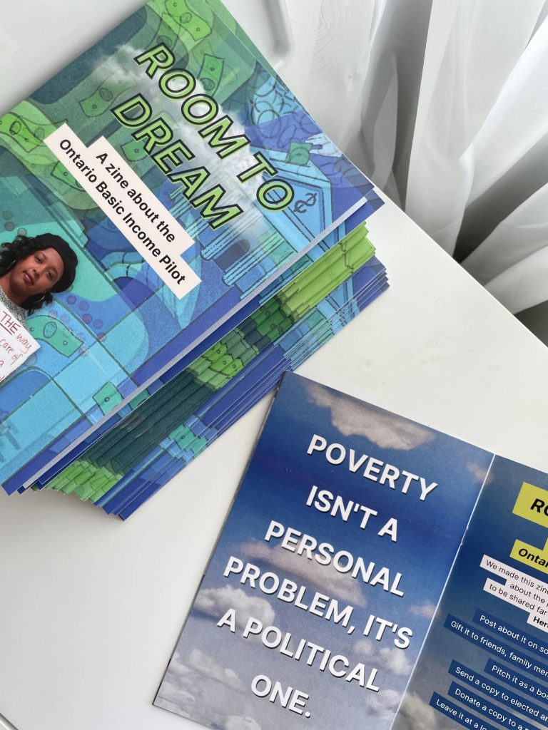 In 2020, I helped establish the Basic Income Youth Collective, a group of young people advocating for a basic income guarantee. Through this group, I share research about basic income and economic justice in creative, accessible forms. Findings from my interviews and the research of fellow BIYC members have been brought to life through initiatives like Basic Income Bought Me, a social media campaign about how people spent their basic income, and Room to Dream, a zine about the Ontario Basic Income Pilot, pairing research findings with handmade collages. These projects influence how I approach knowledge mobilisation in my PhD, which looks at medical eligibility for disability benefits.